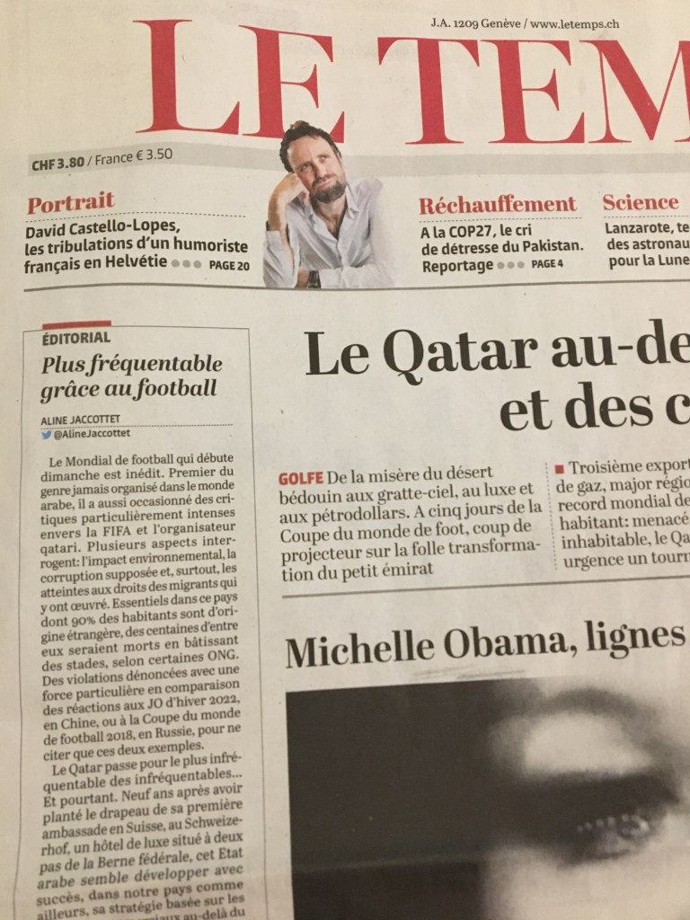 Le Temps se met à l’heure du Quatar, comme tout le monde. Ou presque. Moi j’attends encore quelques jours l’entrée en lice de notre Nati pour me lancer. Pas bien, ça ! Ce vilain Quatar, il faut le boycotter, le vilipender, lui vomir dessus, à la suite des cohortes bien-pensantes. Et là, je reviens au Temps du jour (15 novembre 2022). J’ai apprécié l’édito de une d’Aline Jaccottet. Avant le Quatar, il y avait eu, écrit-elle, les JO de Pékin, le mondial 2018 en Russie… oulalalala, les mauvais souvenirs ! Personne (ou si peu) avaient hurlé aux mauvais traitements des travailleurs et travailleuses, des soupçons de corruption, des libertés aléatoires de ces grands pays laborieux. J’ai aimé cet édito. Il m’a réconforté. Je l’ai adoré. Et je pourrai allumer mon poste de télévision (je suis un vieux) et regarder tous mes matches préférés sans mauvaise conscience. Ouf !